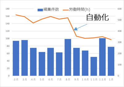 CAM編集自動化の効果としては3人で月平均80件の処理が、1人で対応可能となっています。ほぼ残業もなく編集作業が完了しています。