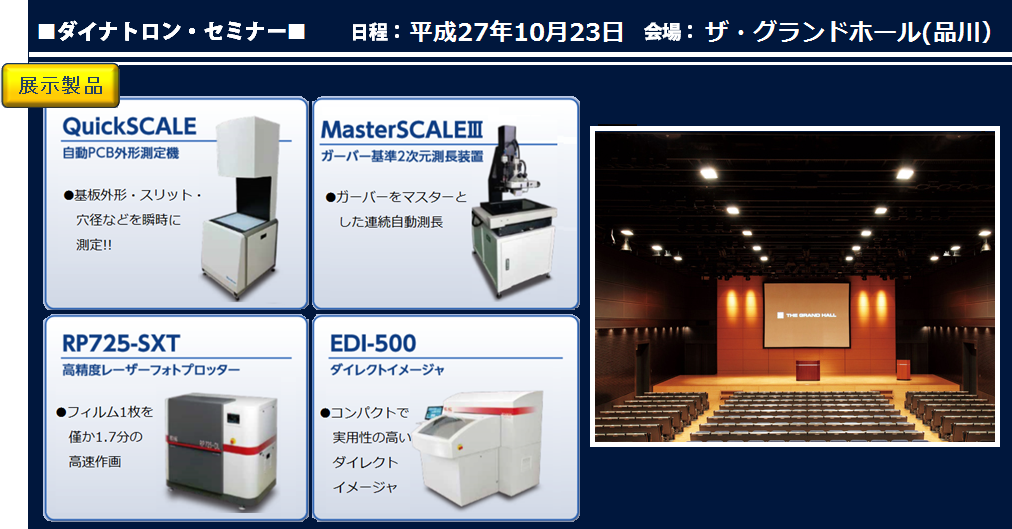 今年のダイナトロンセミナーは、会場を品川に移し、プリント基板CAM編集の自動化・新機能、部品実装CAM・実装支援装置など先進技術・先進装置の展示ご提案を致します。