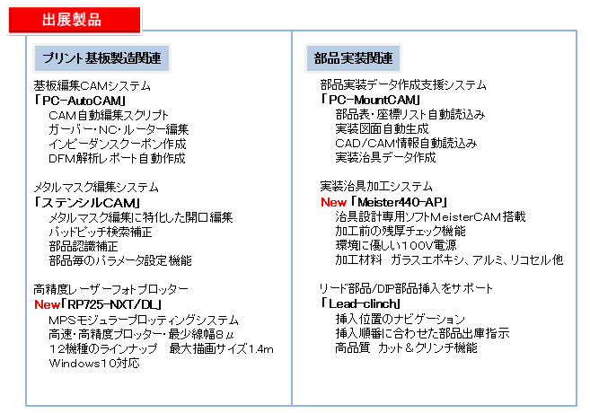 ダイナトロンブースでは、『データコントロールで省人化とスキルレス実現!』をテーマにプリント基板製造エリアでは、レーザーフォトプロッターの新製品「RP725-NXT」部品実装エリアでは、実装治具加工システム「Meister440-AP」の展示、デモンストレーションを実施致します。