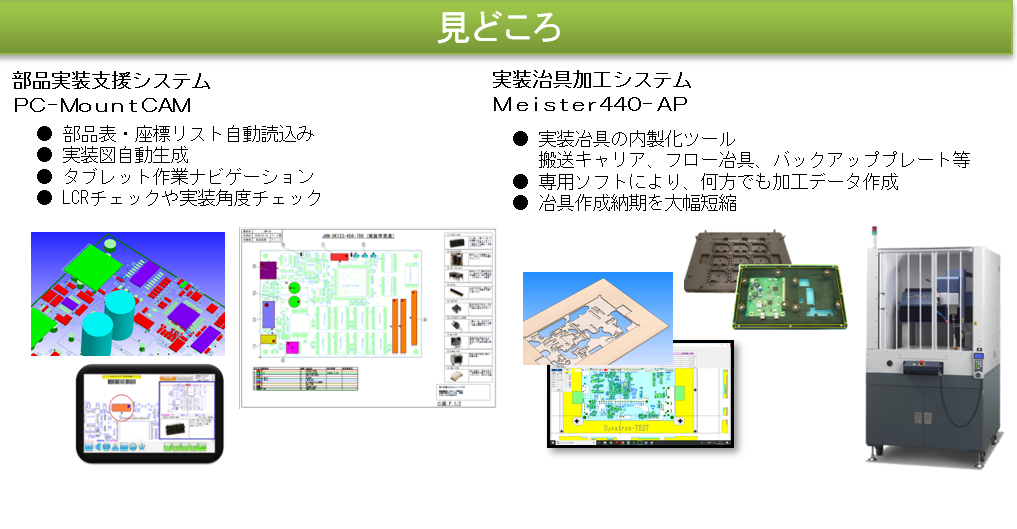第48回 ネプコン ジャパン に出展いたします。ブースでは、基板設計から部品実装までをつなぐCAM主導型エレクトロニクスの製品をデモンストレーションを交え展示いたします。CADデータを有効に使う、部品実装データ作成支援システム「PC-MountCAM」実装冶具の内製化を、強力にアシストする実装用冶具加工システム「Meister440-AP」をご覧ください。ぜひ弊社ブースにお立ち寄りください。