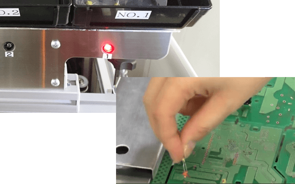 プリント基板裏面から挿入位置を直接LED光でナビゲートすることで、誤実装を防止し、部品を検索する時間を削減します。また、使用する部品のボックスの位置も併せてLED光でナビゲートします。