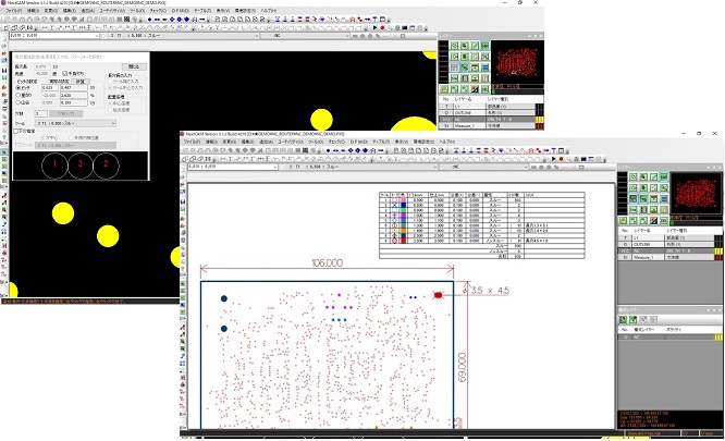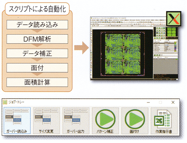 一連のCAM編集作業を自動実行する事ができるスクリプト機能と編集コマンドや外部プログラムを実行するボタンを任意に登録可能なジョブトレー機能があります。