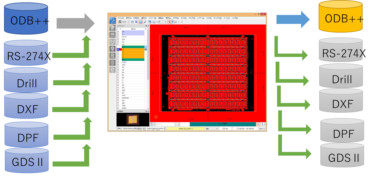 階層構造を活かした編集処理が行えます。 また、アートワークやドリルデータだけでなく、材料のスタックアップ、テストポイントを含むネットリスト、寸法データなどにも対応します。
