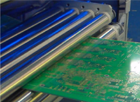 装置内の上下に並ぶローラーの間にプリント基板を通過させ、基板表裏に圧力を掛けながら加熱させることにより反りを修正